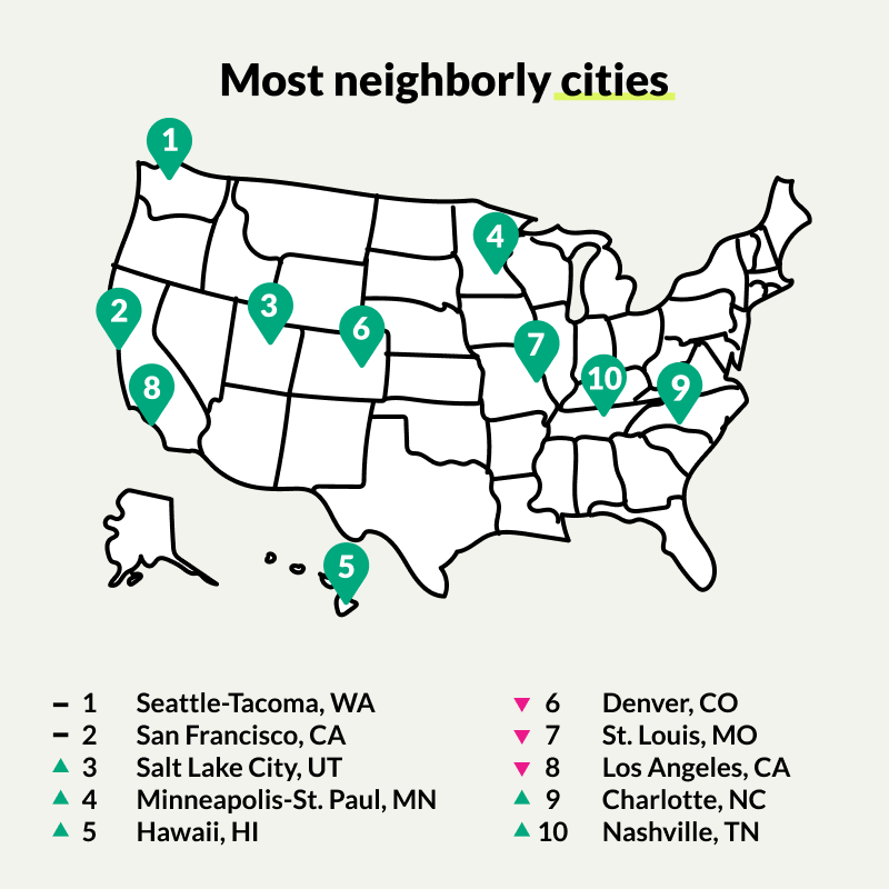 We see natural correlations between our top cities and top states: Seattle claims the title of America’s Most Neighborly City, followed by San Francisco, Salt Lake City, Minneapolis, and Hawaii's major metros (counted as a single market in our analysis). Denver, St. Louis, Los Angeles, Charlotte, and Nashville complete the list.